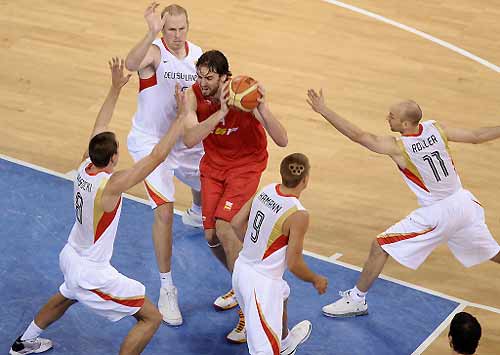 Pau Gasol (C) of Spain is surrounded by German defenders in their men's basketball preliminary round group B match during the 2008 Beijing Olympic Games at the Olympic Basketball Gymnasium on August 14, 2008. Spain won 72-59.[Agencies]