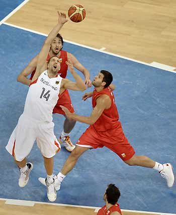 Pau Gasol (behind) of Spain defends as Germany's Dirk Nowitzki (L) reaches up for a pass in their men's basketball preliminary round group B match during the 2008 Beijing Olympic Games at the Olympic Basketball Gymnasium on August 14, 2008. Spain won 72-59.[Agencies]