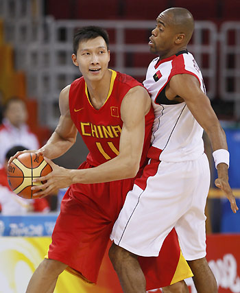 Yi Jianlian of China (L) is guarded by Vladimir Jeronimo of Angola during a men's Group B basketball game at the Beijing 2008 Olympic Games August 14, 2008. [Agencies]