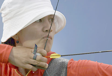 Zhang Juanjuan of China takes aim during her women's individual quarter-final archery round against Joo Hyun-Jung of South Korea at the Beijing 2008 Olympic Games August 14, 2008. Zhang became the first archry winner for Chinese delegation since 1984. [Agencies]