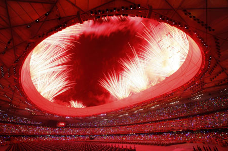 General view shows fireworks lighting up the sky at the start of the opening ceremony of the 2008 Beijing Olympic Games in Beijing on August 8, 2008. The three-hour show at Beijing's iconic "Bird's Nest" national stadium is set to see more than 15,000 performers showcase the nation's ancient history. [Agencies]