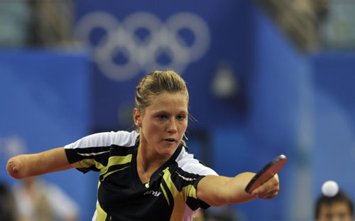 Natalia Partyka of Poland hits a shot to Tie Yana of Hong Kong during their women's team group C singles table tennis match at the Beijing 2008 Olympic Games August 13, 2008.[Agencies]