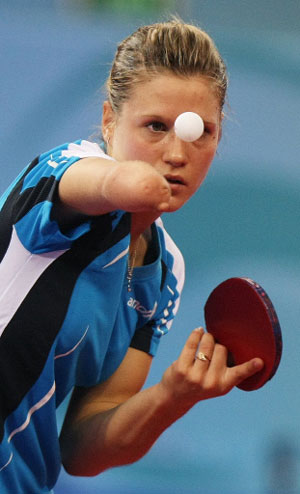 Poland's Natalia Partyka is seen in action during the Women's Team Group C event in the 2008 Beijing Olympic Games, on August 14, 2008.[Agencies]