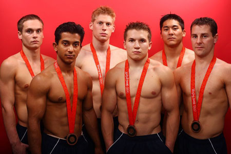 The US Olympic Team for men's gymnastics celebrate they won the team bronze medal at the 2008 Olympic Games in Beijing August 12.