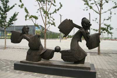 A sculpture features “Cuju”, football event in ancient China in the Beijing Olympic Park[sohu.com]