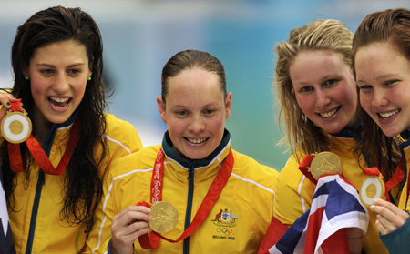 (L-R) Stephanie Rice, Linda Mackenzie, Bronte Barratt and Kylie Palmer of Australia pose with their gold medals after winning the women's 4x200m freestyle relay swimming final at the National Aquatics Center during the Beijing 2008 Olympic Games August 14, 2008. [Agencies]