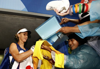 Elena Dementieva of Russia signs autographs after defeating Serena Williams of the US during a women's singles quarterfinal tennis match of the 2008 Beijing Olympic Games in Beijing on August 14, 2008. Dementieva won 3-6, 6-4, 6-3. [Agencies]