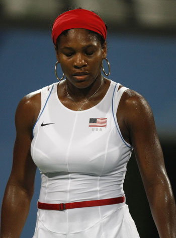 Serena Williams of the US reacts after losing a point to Elena Dementieva of Russia during their women's singles quarterfinal tennis match of the 2008 Beijing Olympic Games in Beijing on August 14, 2008. Dementieva won 3-6, 6-4, 6-3. [Agencies]