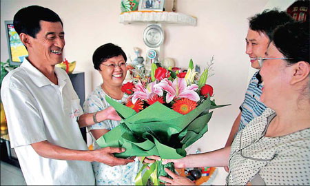Chen Ying's parents (left) accept a bouquet of flowers from neighbors congratulating them on their daughter's success August 14 2008. [Xinhua]