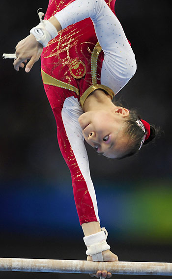 Yang Yilin of China competes on the uneven bars during the women's individual all-around artistic gymnastics final at the Beijing 2008 Olympic Games August 15, 2008. [Agencies]