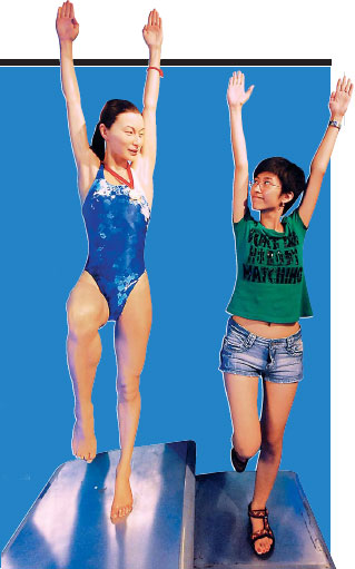 A visitor poses with the wax figure of diver Guo Jingjing at the Shanghai Madame Tussauds Wax Museum. [China Daily]