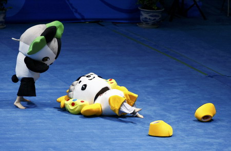 A person dressed as an Olympic mascot talks to another who fell at the venue of the badminton matches of the Beijing 2008 Olympic Games August 14, 2008. [Agencies]