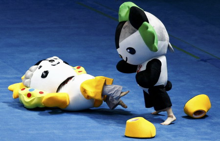 A person dressed as an Olympic mascot tries to assist another who fell at the venue of the badminton matches of the Beijing 2008 Olympic Games August 14, 2008. [Agencies]