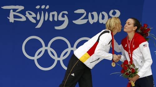 Steffen kisses Coughlin after women's 100m freestyle swimming final at the Beijing Olympics.