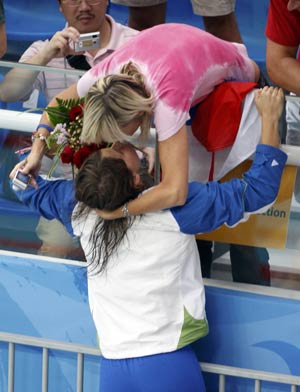 Sara Isakovic (bottom) of Slovenia kisses a woman in the crowd after winning the silver medal in the women's 200m freestyle relay swimming final at the National Aquatics Center.