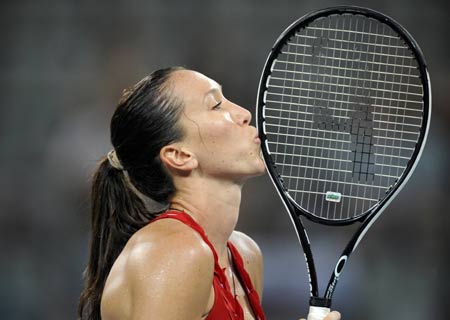 Jelena Jankovic of Serbia kisses her racket during her women's singles third round tennis match against Dominika Cibulkova of Slovakia at the Beijing 2008 Olympic Games August 13, 2008.