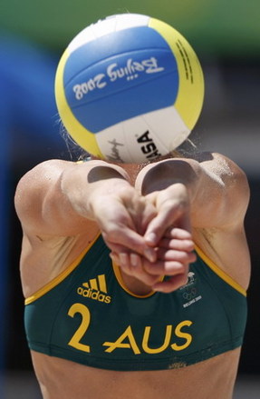 Tamsin Barnett of Australia saves a shot during her women's round of 16 beach volleyball match, with teammate Natalie Cook, against Greece at the Beijing 2008 Olympic Games August 15, 2008. [Agencies]