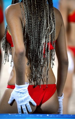 A cheerleader waits for performing during the 2008 Beijing Olympic Games men's preliminary beach volleyball match US vs. Japan at Beijing's Chaoyang Park Beach Volleyball Ground on August 14, 2008, in Beijing. [Agencies]