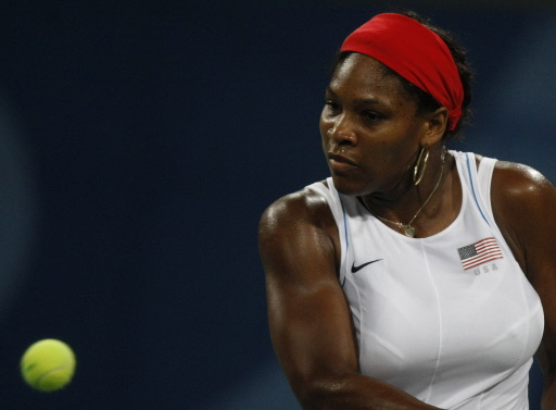 Serena Williams of the US hits a return to Elena Dementieva of Russia during their women's singles quarterfinal tennis match of the 2008 Beijing Olympic Games in Beijing on August 14, 2008.[Agencies]