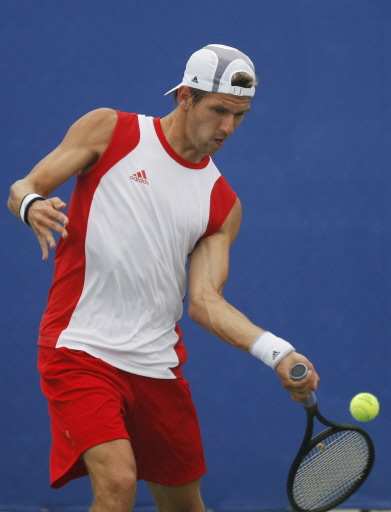 Austria's Jurgen Melzer returns the ball to Taiwan's Lu Yen-Hsun during their 2008 Beijing Olympic Games men's singles third round tennis match on August 13, 2008 in Beijing. Melzer won 6-2, 6-4.[Agencies]