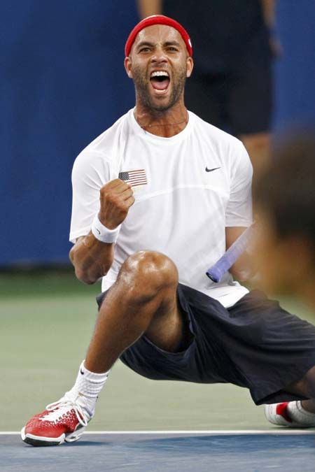 James Blake of the US reacts after defeating Roger Federer of Switzerland during a mens's singles quarterfinal tennis match against at the Beijing 2008 Olympic Games, August 14, 2008.[Agencies]