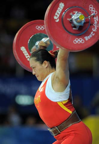 Cao Lei of China competes in the women's 75 kg weightlifting eventat the 2008 Beijing Olympic Games on August 15, 2008. Cao won the gold medal in the event. [Agencies]