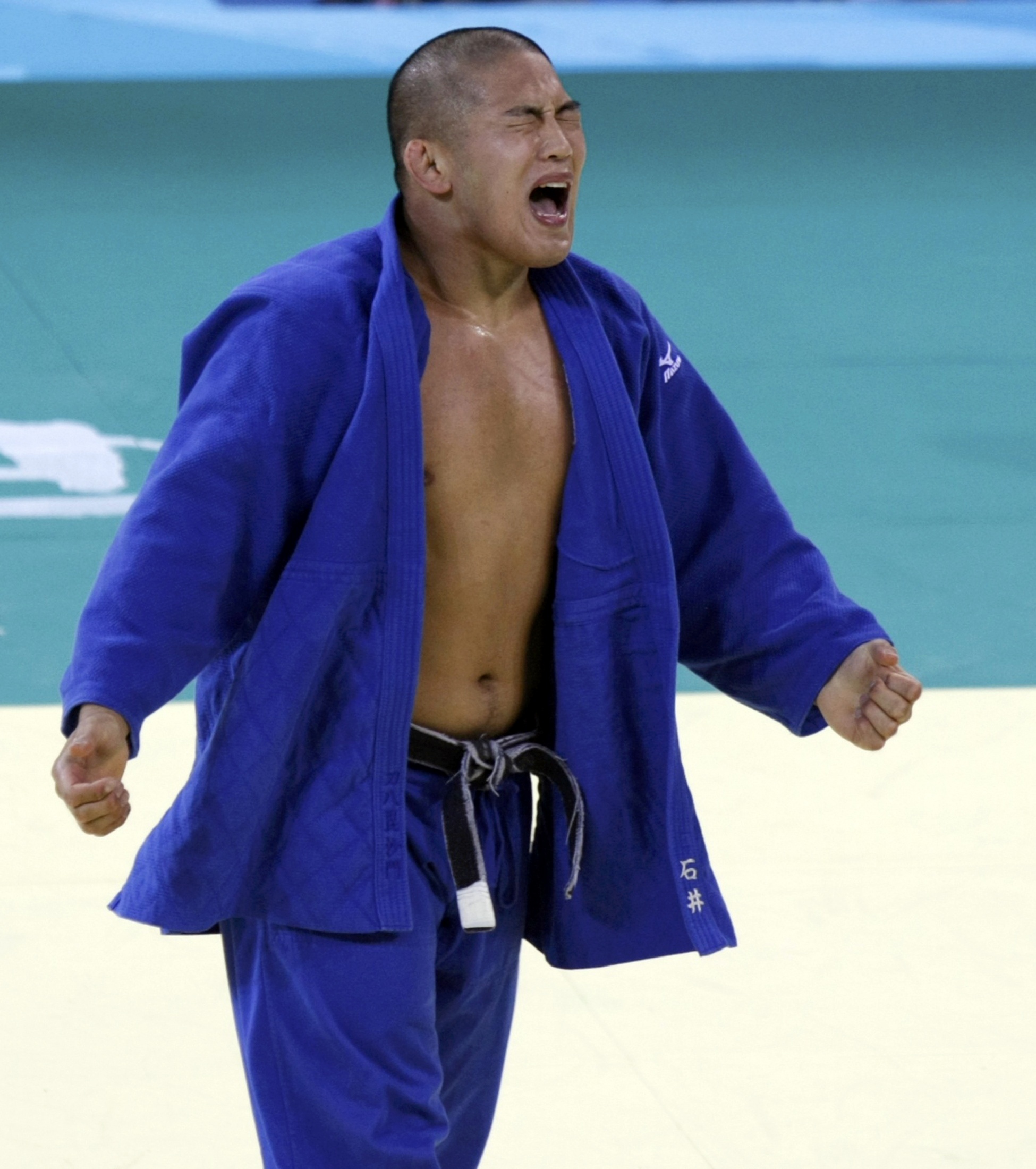 | Satoshi Ishii of Japan reacts after defeating Abdullo Tangriev (not seen) of Uzbekistan in their men's +100kg gold medal judo match at the Beijing 2008 Olympic Games August 15, 2008. [Agencies] |