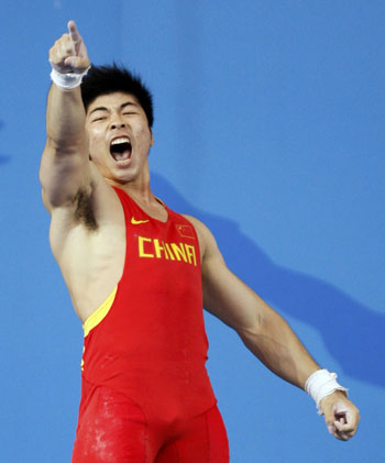 Lu Yong of China celebrates after lifting 214kg in the the men's 85kg Group A clean and jerk weightlifting competition at the Beijing 2008 Olympic Games August 15, 2008. [Agencies]