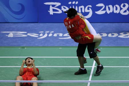 Yu Yang (R) of China hugs her coach as her compatriot Du Jing celebrates after winning their women's doubles badminton final against South Korea at the Beijing 2008 Olympic Games August 15, 2008. [Agencies]