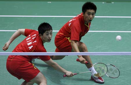 Yu Yang (L) and Du Jing of China compete during their women's doubles badminton final against South Korea at the Beijing 2008 Olympic Games August 15, 2008. [Agencies]