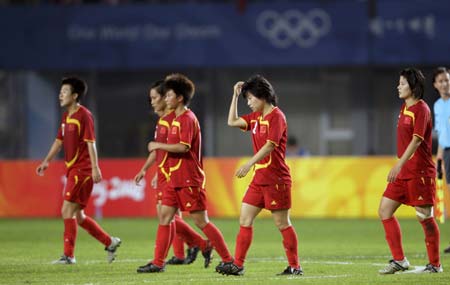 China's players leave the pitch after their women's quarterfinal soccer match loss to Japan at the Beijing 2008 Olympic Games in Qinhuangdao August 15, 2008. [Agencies]