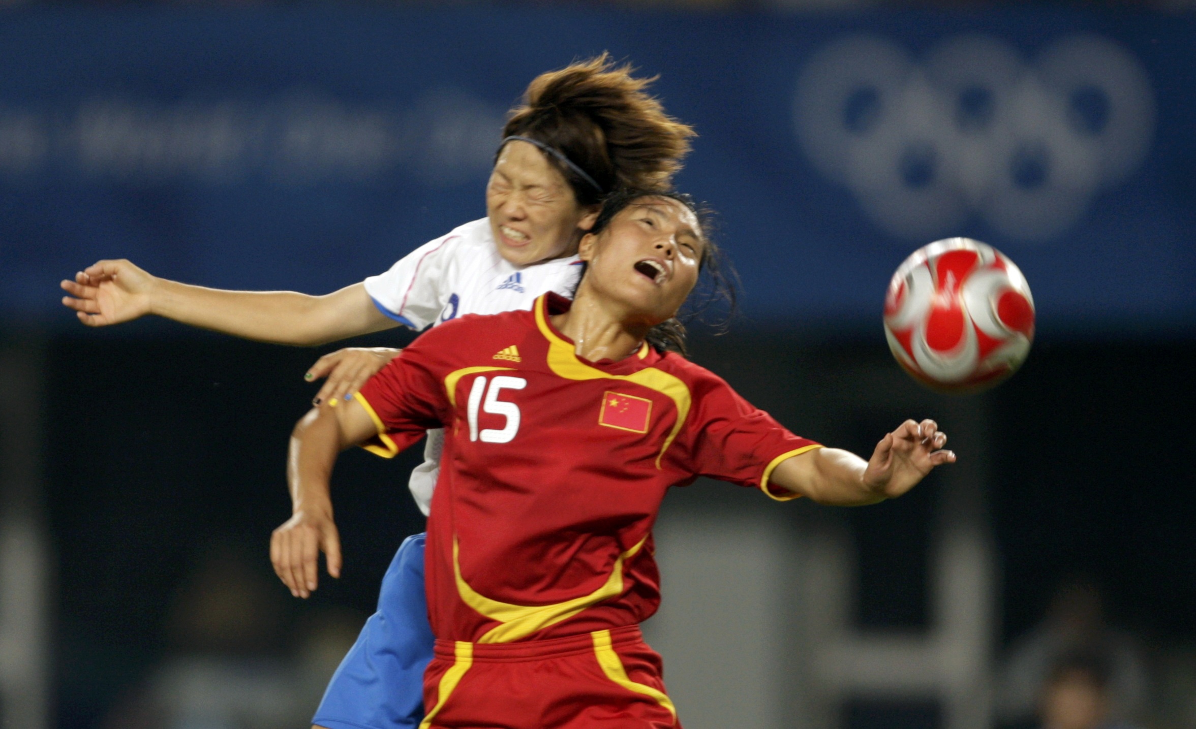 | Zhou Gaoping (red) of China and Aya Miyama of Japan fight for the ball during the women's quarterfinal soccer match at the Beijing 2008 Olympic Games in Qinhuangdao August 15, 2008. [Agencies] |