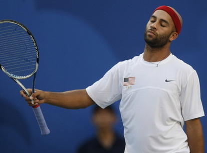 James Blake of the US reacts after losing a point to Fernando Gonzalez of Chile in their men's singles semi-final tennis match during the 2008 Beijing Olympic Games in Beijing on August 15, 2008. Gonzalez won 4-6, 7-5, 11-9. [Agencies]