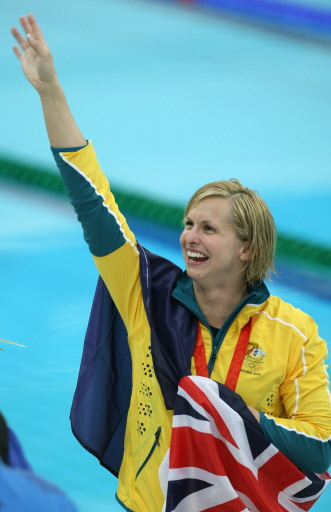Australia's Lisbeth Trickett waves covered in an Australian flag during the women's 100m butterfly swimming medal ceremony at the National Aquatics Center in the 2008 Beijing Olympic Games on August 11, 2008. [Agencies]