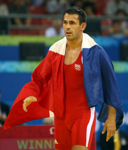 France's bronze medalist in the 74 kg greco-roman wrestling category of the 2008 Beijing Olympic Games Christophe Guenot poses with the French flag on his shoulders on August 13, 2008 in Beijing.[Agencies]