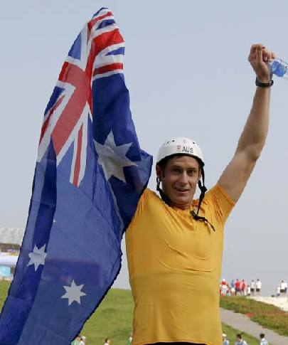 Robin Bell of Australia holds his country's flag as he celebrates his third place in his men's canoe (C1) final at the Beijing 2008 Olympic Games August 12, 2008. [Agencies]
