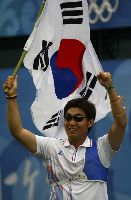 Im Dong-hyun of South Korea holds the national flag after beating Italy in the men's team archery gold medal match at the 2008 Beijing Olympic Games August 11, 2008. [Agencies]