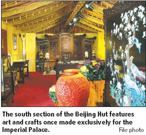 Entering the south section of the hut is like stepping into a king's study. A huge redwood antique table lies in the upper east area with a golden throne and delicately carved wooden screen in the backdrop. Amid the display are two inlaid gold lacquer wares in the shape of white cranes, which symbolize immortals in Chinese mythology.