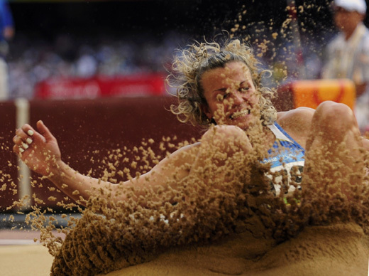 Nataliia Dobrynska of Ukraine competes in the long jump event of the women's heptathlon in the athletics competition in the National Stadium at the Beijing 2008 Olympic Games August 16, 2008. [Agencies]