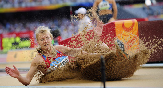 Anna Bogdanova of Russia competes in the long jump event of the women's heptathlon in the athletics competition in the National Stadium at the Beijing 2008 Olympic Games August 16, 2008. [Agencies]