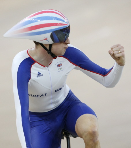 | Track cyclist Bradley Wiggins of Great Britain celebrates after winning the 2008 Beijing Olympic Games men's individual pursuit first round at the Laoshan Velodrome in Beijing on August 16, 2008.[Agencies] |
