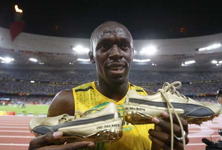 Usain Bolt of Jamaica celebrates winning the men's 100m final of the athletics competition in the National Stadium at the Beijing 2008 Olympic Games August 16, 2008. Bolt won 100 metres gold at the Beijing Olympics in a world record time on Saturday, running 9.69 seconds to claim victory in an exhilarating showdown with his compatriot Asafa Powell. [Agencies]