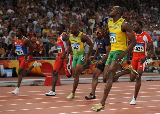 Jamaica's Usain Bolt (R) wins the men's 100m final at the National Stadium as part of the 2008 Beijing Olympic Games on August 16, 2008. [Agencies]