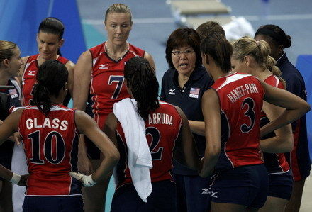 US head coach Lang Ping talks to her players during their women's preliminary pool A volleyball match against Venezuela at the Beijing 2008 Olympic Games August 13, 2008. [Agencies]