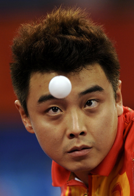Wang Hao of China serves during his men's team semi final table tennis singles match against Ryu Seung-Min of South Korea at the Beijing 2008 OIympic Games August 16, 2008.