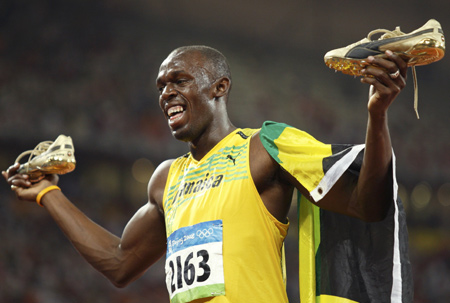 Usain Bolt of Jamaica celebrates winning the men's 100m final of the athletics competition in the National Stadium at the Beijing 2008 Olympic Games August 16, 2008. Bolt won 100 metres gold at the Beijing Olympics in a world record time on Saturday, running 9.69 seconds to claim victory in an exhilarating showdown with his compatriot Asafa Powell. [Agencies]
