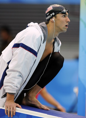 Michael Phelps of the US prepares to swim in the men's 100m butterfly semi-finals at the National Aquatics Center during the Beijing 2008 Olympic Games August 15, 2008. [Agencies]