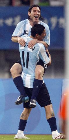Argentina's Lionel Messi (top) celebrates with team mate Angel Di Maria after he scored his team's first goal against Netherlands in their men's quarterfinal soccer match in the Shanghai Stadium at the Beijing 2008 Olympic Games, August 16, 2008.[Agencies]