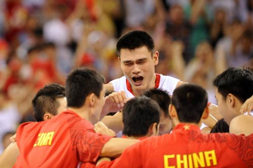 Chinese basketball striker Yao Ming (C) celebrates with team-mates after winning a preliminary round group A basketball match of the Beijing 2008 Olympic Games against Germany at the Olympic basketball Arena in Beijing on August 16, 2008. China won 59 to 55.[Agencies]