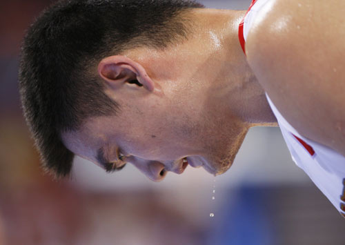 Drops of sweat fall from the face of Yao Ming of China during their preliminary Group B men's basketball game against Germany at the Beijing 2008 Olympic Games August 16, 2008.China won 59 to 55.[Agencies]